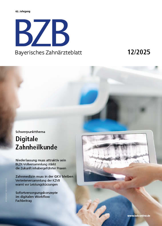 Das Bayerische Zahnärzteblatt (BZB) wird in einer Herausgebergemeinschaft gemeinsam von der Bayerischen Landeszahnärztekammer (BLZK) und der Kassenzahnärztlichen Vereinigung Bayerns (KZVB) publiziert. Das BZB ist das Amtliche Mitteilungsblatt der Bayerischen Landeszahnärztekammer sowie der Kassenzahnärztlichen Vereinigung Bayerns. Auf dieser Website finden Sie ausgewählte Beiträge aus der aktuellen Ausgabe sowie auch die vollständigen E-Paper-Versionen von BZB und BZBplus.
