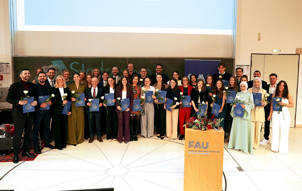 Bei einem feierlichen akademischen Festakt wurden 38 Absolventinnen und Absolventen der Zahnmedizin an der Friedrich-Alexander-Universität Erlangen-Nürnberg offiziell geehrt. Studiendekan Prof. Dr. Tilmann Volk, die Klinikdirektoren Prof. Dr. Kerstin Galler, Prof. Dr. Lina Gölz, Prof. Dr. Dr. Marco Kesting und Prof. Dr. Manfred Wichmann sowie BLZK-Präsident Dr. Dr. Frank Wohl gratulierten den Absolventen.