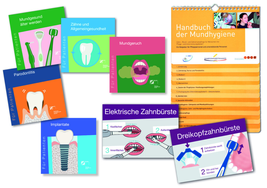 Neben dem Schulungskoffer bietet die BLZK auch das Paket „Pflege“ an, das verschiedene Infomaterialien für Patienten und Pflegende rund um die Mundpflege im Alter und in der Pflege enthält – zum Beispiel das „Handbuch der Mundhygiene“ sowie die Pockets „Mundgesund älter werden“, „Parodontitis“, „Zähne und Allgemeingesundheit“, „Implantate“ und „Mundgeruch“. Die Infomaterialien eignen sich gut, um sie Patientinnen und Patienten in der Praxis oder Pflegenden im Rahmen von Schulungen zur Mitnahme anzubieten. Das Paket „Pflege“ ist im Bestellservice der BLZK für 45 Euro inklusive Versand erhältlich.