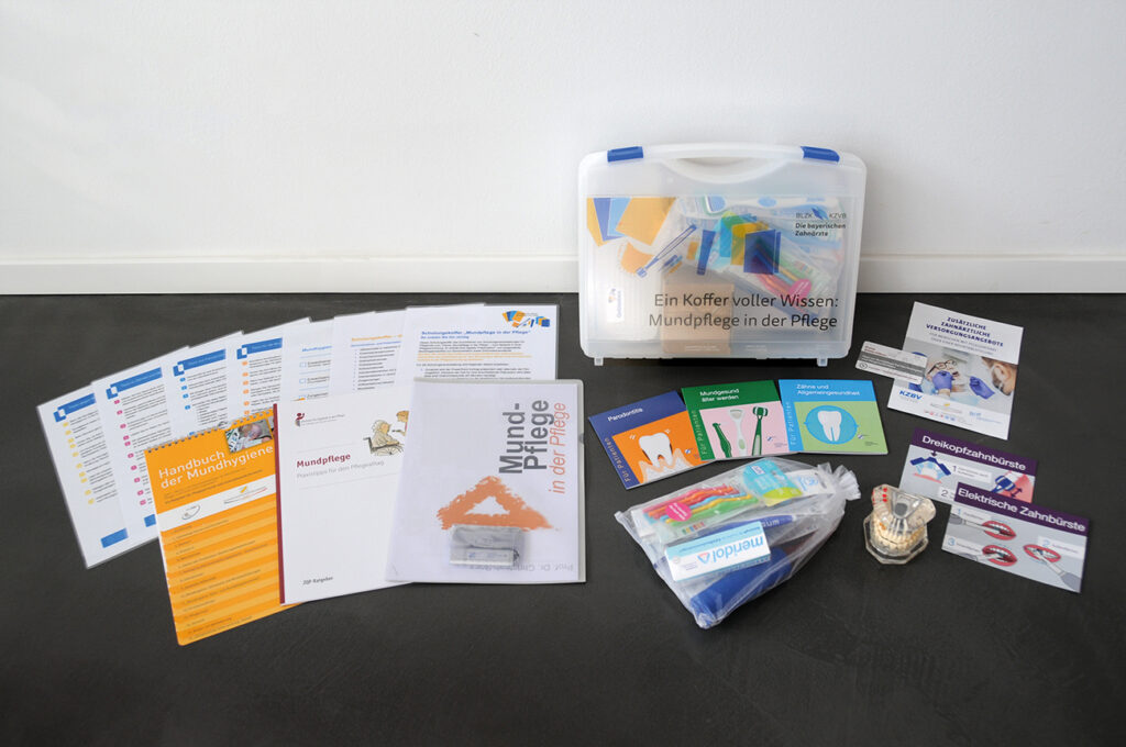 Für Zahnärztinnen und Zahnärzte, die zum Beispiel Pflegepersonal in Pflegeheimen oder pflegende Angehörige schulen, bietet die Bayerische Landeszahnärztekammer einen Schulungskoffer an: Der Koffer mit dem Titel „Ein Koffer voller Wissen: Mundpflege in der Pflege“ enthält alles, was für eine Schulung benötigt wird – allem voran einen Mustervortrag. Außerdem befindet sich im Koffer ein Demogebiss und eine große Auswahl an Mundhygieneprodukten wie Dreikopfzahnbürste, Griffverstärkung, Prothesenbürste und Mundstütze, die sich zu Präsentationszwecken nutzen lassen. Infomaterialien wie verschiedene thematisch passende Pockets und Infoblätter der BLZK, das „Handbuch der Mundhygiene“ der BZÄK und der Ratgeber „Mundpflege – Praxistipps für den Pflegealltag“ des Zentrums für Qualität in der Pflege (ZQP) ergänzen das Angebot. Der Schulungskoffer ist für Zahnärztinnen und Zahnärzte zum Selbstkostenpreis von 100 Euro inklusive Versand bestellbar.